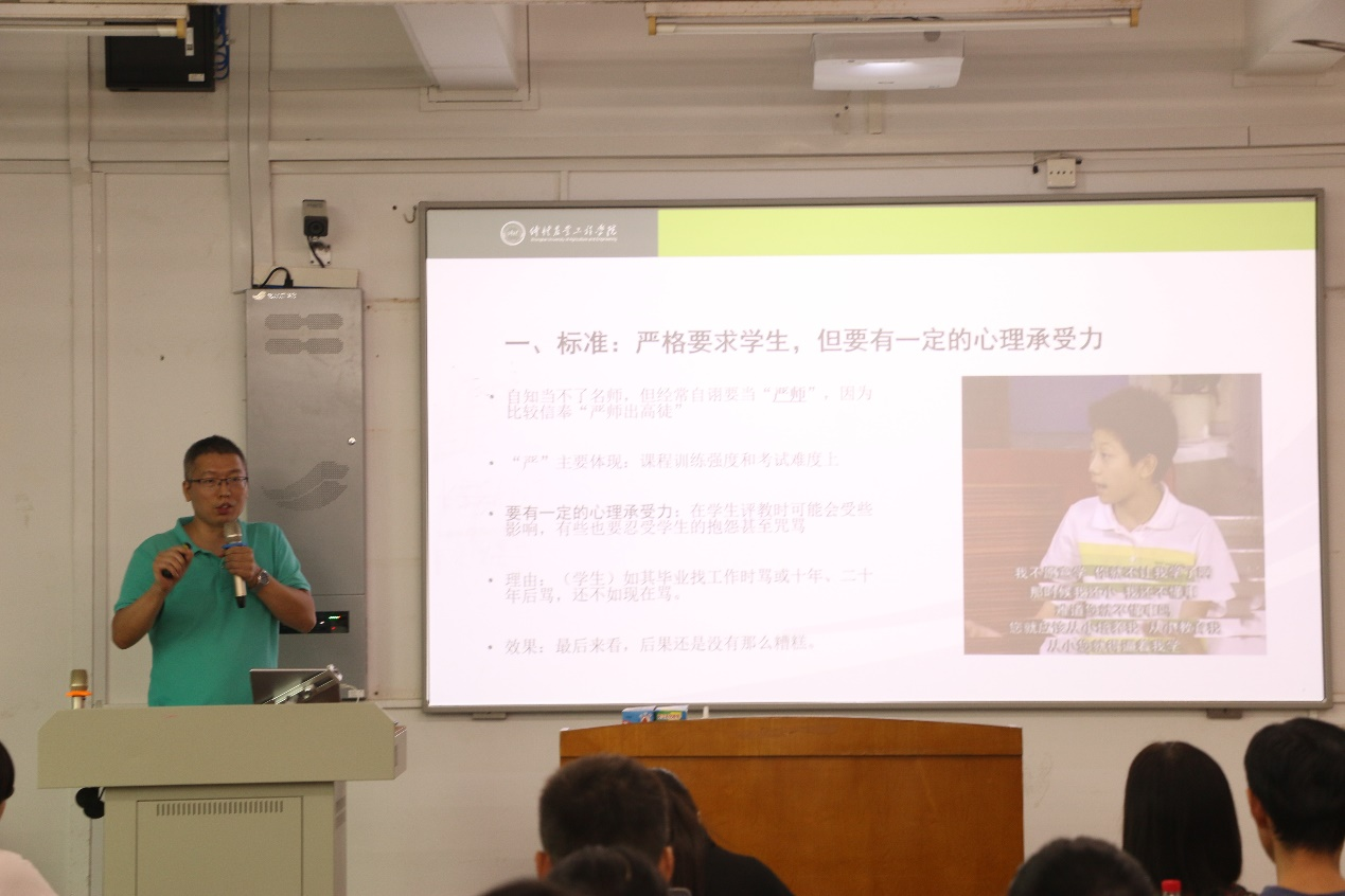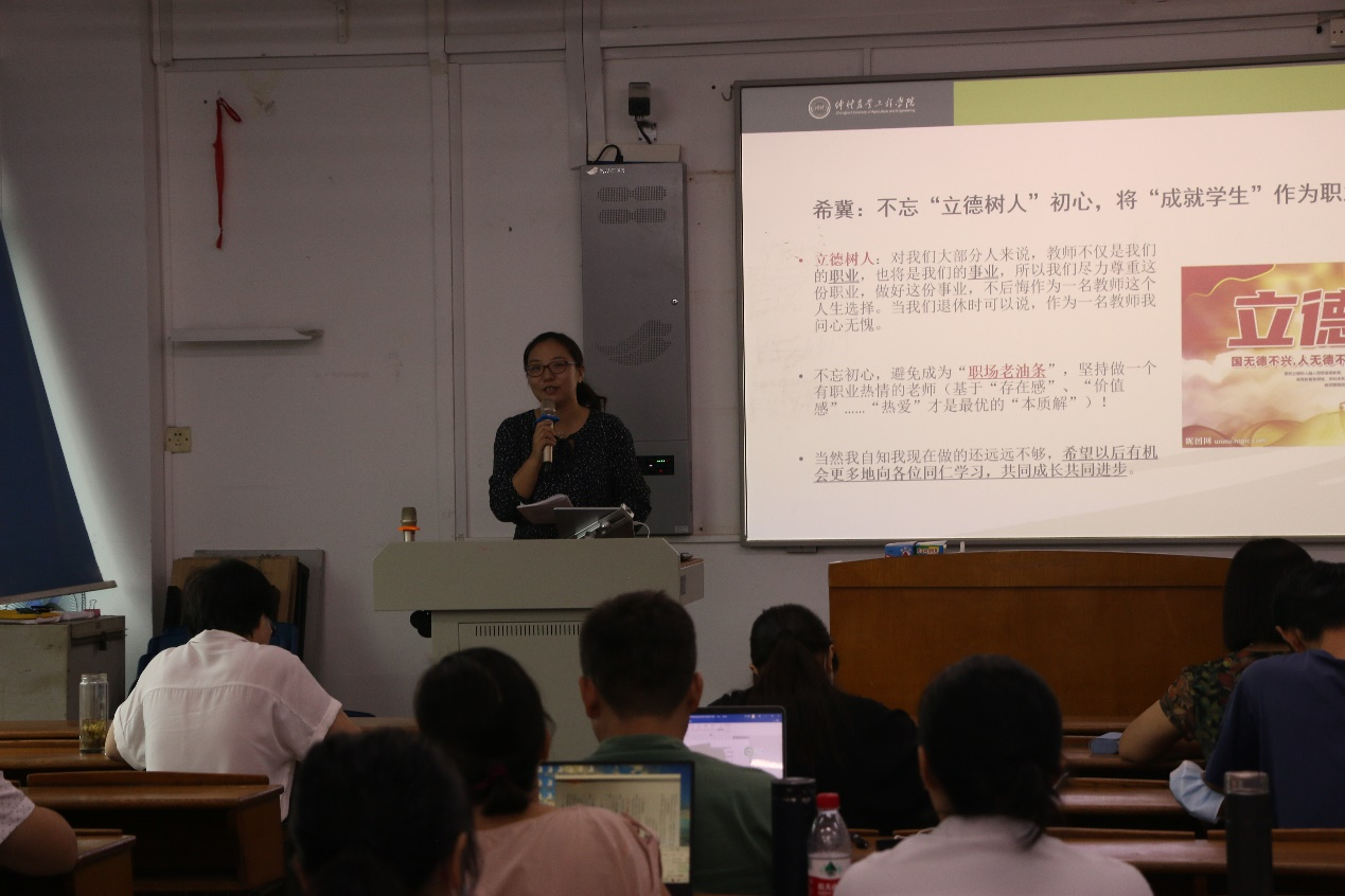 会上,孙林以“传承人文传统,弘扬时代强音”为主题分享自己的育人感受。他从三个方面分享自己的教学经验。第一,在教学标准上要严格要求学生,同时也要有一定的心理承受能力,不惧怕学生的抱怨和指责。第二,在自身行为上要去影响学生,尽量创造机会培养学生,鼓励其参加各种活动,引导他们成长与成才。第三,在教学态度上要公平地对待学生,不要刻意为难他们,要相信每个学生都是未来可期的。最后,他希望各位老师能够不忘初心,热爱工作岗位,坚守立德树人的使命,将“成就学生”作为自己的职业追求。