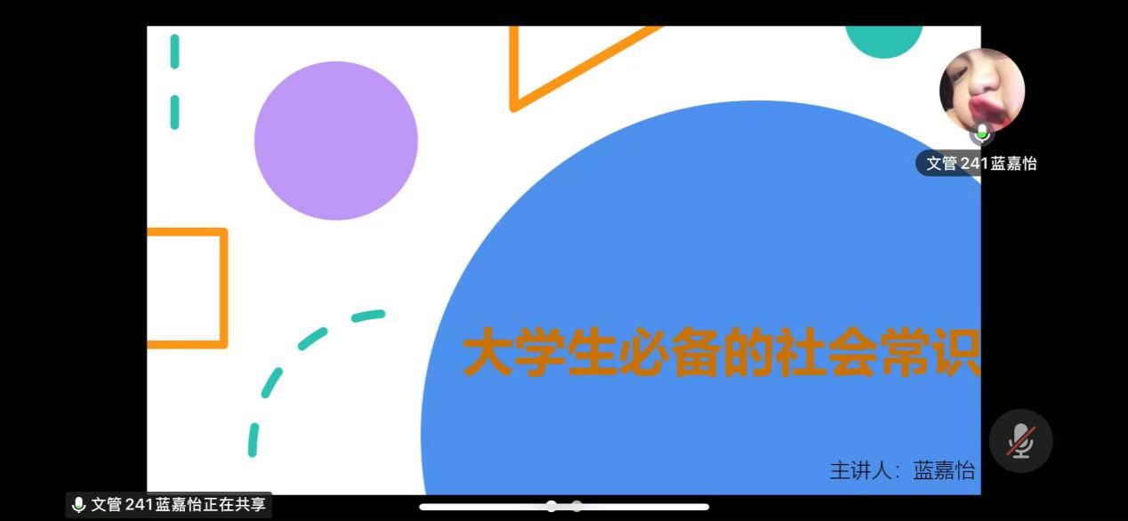 文管241班蓝嘉怡同学主讲了“大学生必备的社会常识”主题分享课。她针对“六险二金”、医保与社保的区别、税务缴纳等常见盲区,结合自身认知进行系统梳理,强调掌握此类常识对保障个人权益、理解社会运行具有重要意义。此外,她还拓展分享了劳动权益保障、急救常识、厨房安全等独立生活技能,帮助同学们夯实社会适应能力,为迈向职场与独立生活做好知识储备。