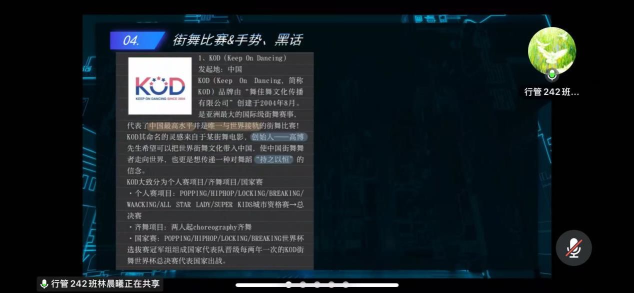 行管242班的林晨曦主讲了“街舞新‘识’代”主题分享课。课程从街舞起源与嘻哈文化切入,介绍Breaking、Popping等舞种特点,设置“看视频猜舞种”互动环节,并揭秘手势暗语与文化内涵。课程兼具专业性与趣味性,带领同学们从零走进街舞世界,点燃青春热情,展现青年学子积极向上的文化风采。